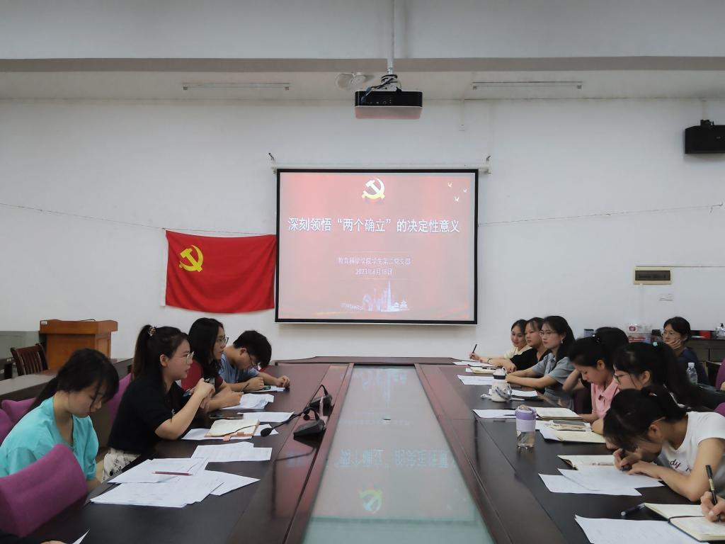 会上,李梓兰同志组织该支部全体学生党员深入学习领悟“两个确立”的决定性意义,她表示,要认真学习“两个确立”的内容与涵义,明白“两个确立”是党在新时代取得的重大政治成果,是推动党和国家事业取得历史性成就、发生历史性变革的决定性因素。“两个确立”反映了全党全军全国各族人民共同心愿。随后,学生党员互相讨论,纷纷表示要坚定不移跟党走,听党话。