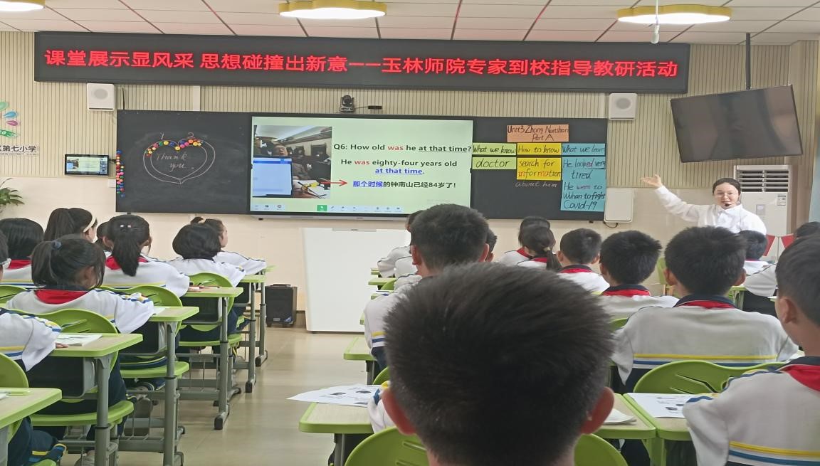 活动在玉东新区第七小学教师谢开怡的英语汇报课中拉开帷幕。她执教的内容是闽教版五年级下册《Unit3 Zhong Nanshan》。课堂中,她以猜英雄的绕口令引出钟南山,让学生观看视频并寻找设定问题的答案,对比钟南山现在和过去的状态,以此讲解一般过去时的语法。然后让学生朗读课文,观看英雄图片谈谈感受,并让学生谈论李兰娟。英语汇报课结束,玉东新区第七小学教师谢珊珊展开语文汇报课。她执教的内容是部编版一年级下册第十课《端午粽》。课堂中,她以猜节日导入,采用游戏、儿歌形式教识字写字,带领学生有感情地朗读课文。课文分段精讲,并展示真实的箬竹叶让学生闻、摸和嗅,观看包粽子的视频了解其步骤,并组织学生说一说自己与亲人在端午节做粽子的故事。