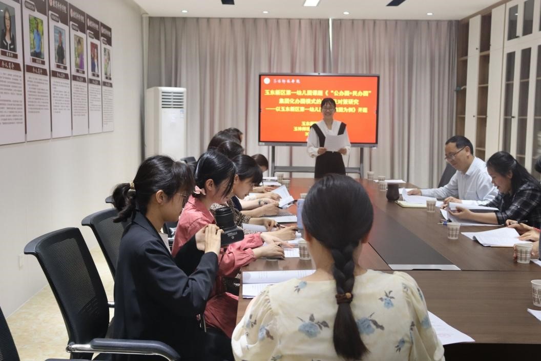 此次教研活动围绕玉东新区第一幼儿园课题《“公办园+民办园集团化办园模式的问题以及对策研究——以玉东新区第一幼儿园教育集团为例”》的开题进行研讨,研讨会上,潘丽芬详细介绍了立项书内容。随后,李振华副园长从“国内外研究情况”、“研究意义”、“研究价值”“研究内容”“创新之处”等方面介绍此课题。她表示此课题的初心是努力让每个孩子都享有公平而有质量的教育。随后,我院领导和老师分别对《“公办园+民办园集团化办园模式的问题以及对策研究——以玉东新区第一幼儿园教育集团为例”》课题研究的科学性及可行性进行探讨,谢清理副院长提出该课题的本质是“优质园与薄弱园不在起跑线怎么办”,其主要目的是提升民办幼儿园的教学水平,课题具有研究价值。最后,陈颖园长表示,感谢各位领导老师的关心和指导,希望老师们能够以此次研讨会为契机,互学互进,协同提升,继续扎实开展研究工作,提炼研究成果。