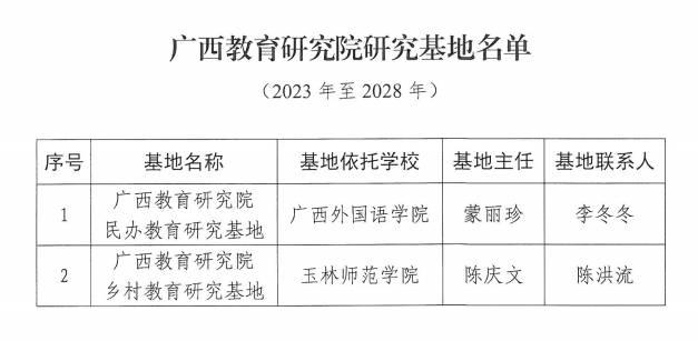近日,广西教育研究院下发《广西教育研究院关于公布设立民办教育研究基地、乡村教育研究基地的通知》(桂教研院〔2023〕32号),决定依托我校设立广西教育研究院乡村教育研究基地。