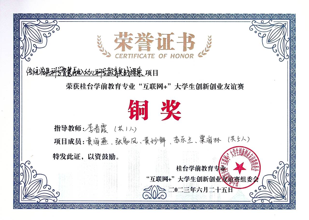为学习贯彻党的二十大精神和习近平总书记关于对台工作的重要论述,不断巩固桂台教育交流合作常态化长效机制,深化桂台学前教育专业人才培养的交流与合作,提升两岸大学生创新创业能力,促进两岸大学生相互了解、增进友谊,自治区教育厅举办桂台学前教育专业“互联网+”大学生创新创业友谊赛。本次比赛由学院党委书记崔海波书记指导的《中草药走进幼儿园——以玉林中药港为依托》项目团队、由李春霞老师指导的《传统农具科学智慧融入幼儿园科学教育实践探索》项目团队荣获两项铜奖。