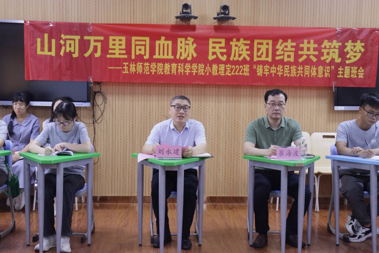 4月19日下午,学校党委常委、副校长刘永建深入教育科学学院小学教育理定向222班参加山河万里同血脉民族团结共筑梦——“铸牢中华民族共同体意识”主题班会,该院党委书记崔海波,该班班主任,辅导员及小学教育理定向222班全体学生参加班会。