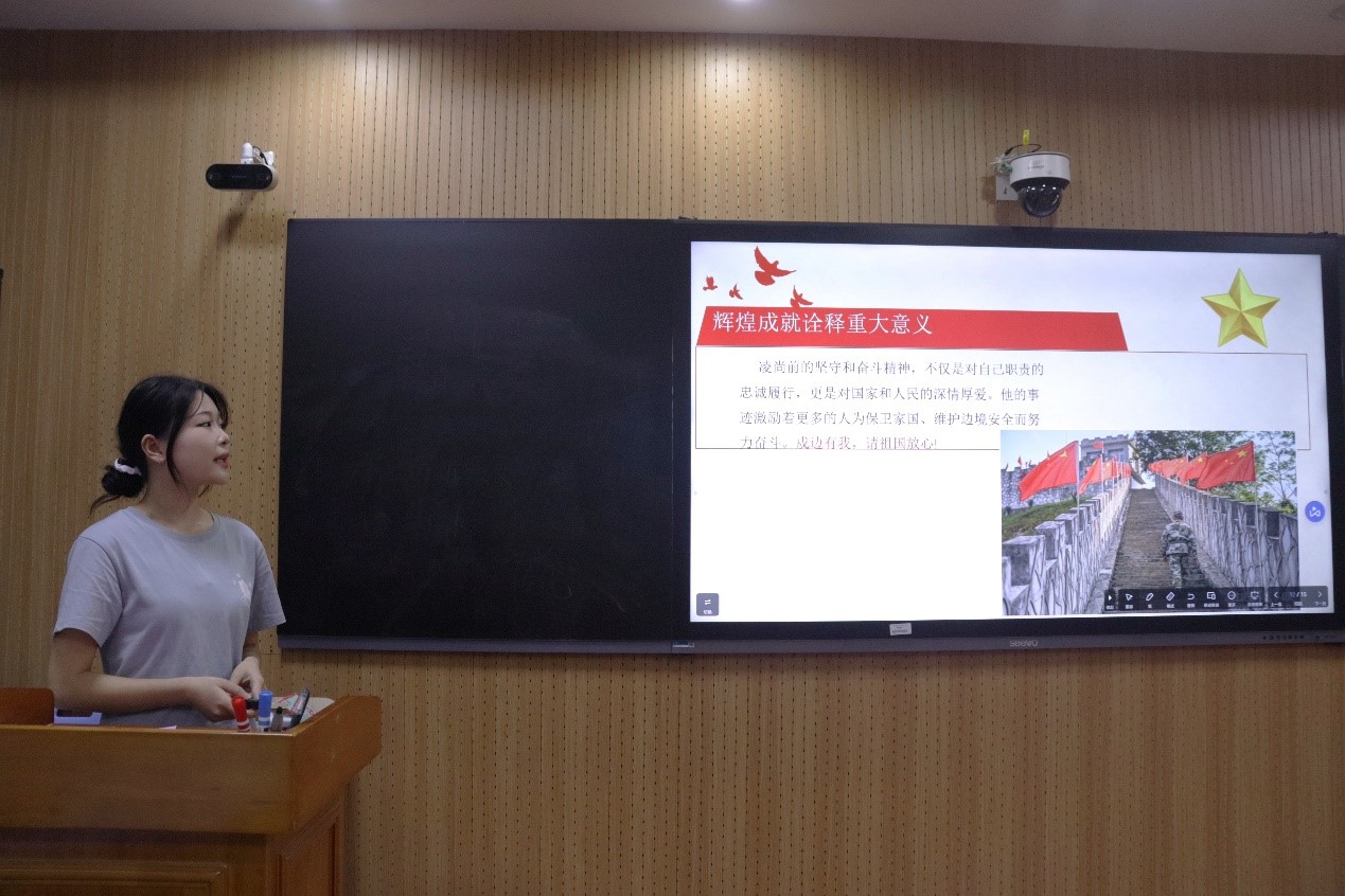 学生代表分享驻守在广西边境线上凌尚前、陆兰军2名哨兵坚决守住守好祖国“南大门”的感人事迹,师生们被驻守边疆哨兵的精神所感动,心灵得到了感染和洗礼,纷纷表达内心的感动之情和深刻领悟。