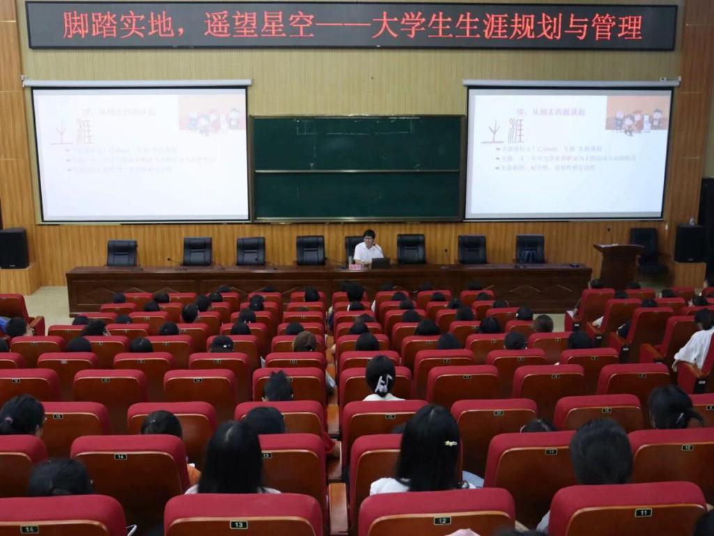 9月20日下午,陈宛玉在东校区明德楼113教室为我院2023级全体新生讲授“脚踏实地,遥望星空——大学生生涯规划与管理”主题讲座。在讲座中,陈宛玉围绕生涯的简约漫谈、生涯的一些内外认识和生涯希望的链接作用三个方面为学生们展示了大学生职业生涯规划的重要性和做法。陈宛玉在讲到生涯的简约漫谈这一部分时,从倒走西游谈起,告诉同学们进行生涯规划与管理的重要性,以及不远将来要面临的任务,从而引起新生对自己生涯事宜的思考。在讲生涯希望的链接作用中,陈宛玉告诉同学们在自己生涯希望的链接中,要保持积极期待、学会设定目标、善于找寻路径、掌握动因促进、不断反省调整。