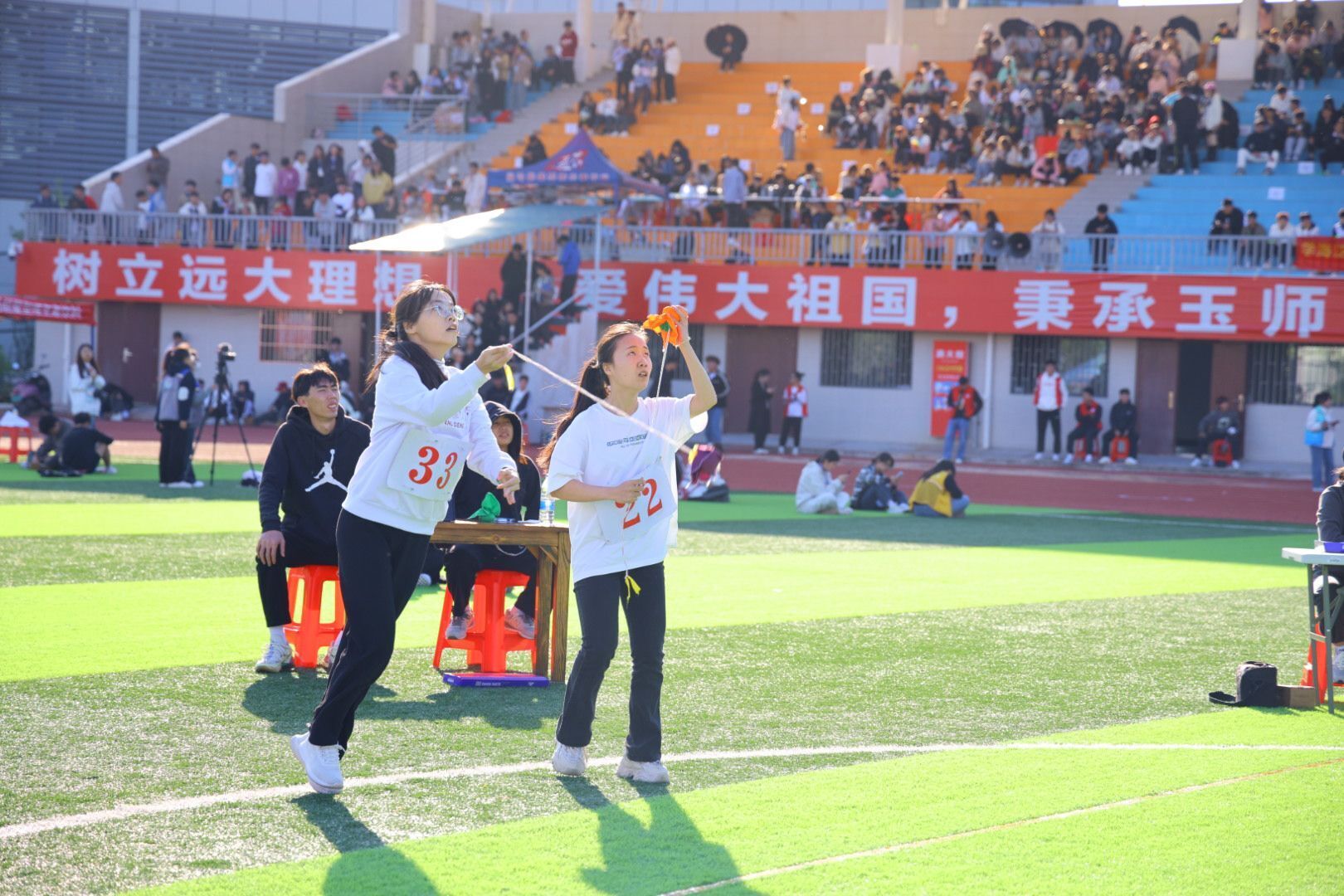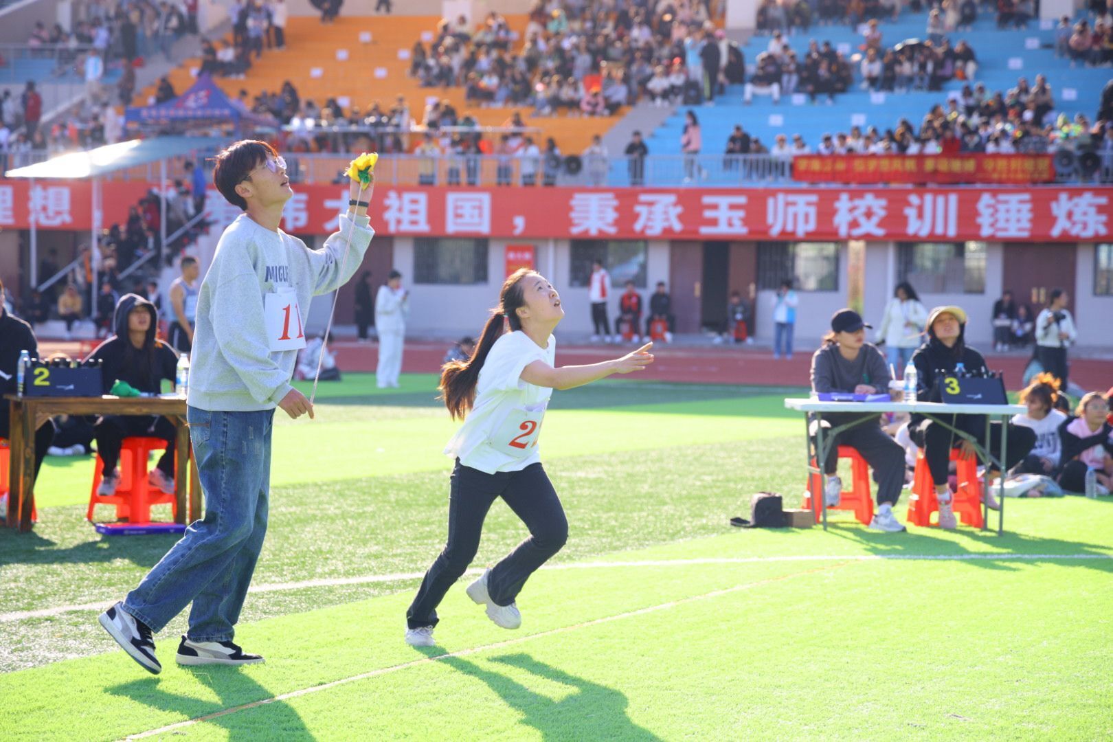 比赛开始前,运动员陆续入场,积极开展赛前热身准备,进行绣球试抛,适应比赛场地。随着裁判的一声哨响,比赛正式开始,我院运动员全力以赴,持球瞄准高杆上的圆环,娴熟而又灵活地将绣球抛出,以准确力度与合适角度将绣球精准地投入高高竖立球框中,赢得观众阵阵掌声。观众的视线凝聚在绣球的每一次抛起与落下,加油助威声此起彼伏、不绝于耳。随着倒计时不断推进,我院运动员努力抓住最后机会,将手中的绣球一个接一个抛出。他们快速奔跑着,即使汗水沾湿脸庞,仍旧拼尽全力,只为争取多进几个球,取得好成绩,为学院赢得荣誉,给在场观众带来了一场激动人心的比赛。