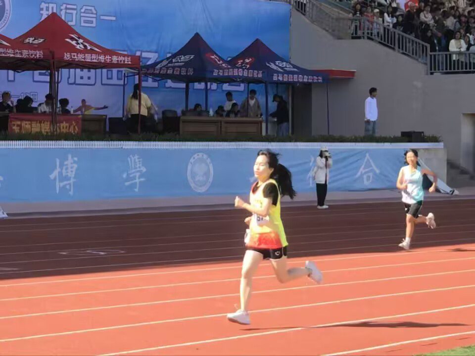比赛开始前,运动员斗志昂扬,信心满满,积极进行拉伸、原地小腿跑、试跑等热身运动,争取调整最佳状态迎接比赛。随着比赛枪声响起,我院运动员如同离弦的箭冲出起跑线,破风而行的气势引起全场观众的沸腾,加油呐喊声接连不断。运动员用轻盈而不失力量的步伐互相追赶着,平稳呼吸,协调动作,稳步前行,一时间分不出上下。弯道阶段,运动员使用不同的战略技巧攻坚关键节点,加快脚步,实现弯道超车,为观众们展现一场体力与脑力、意志力相结合的精彩角逐。观众席上拉拉队为运动员加油鼓劲,加油呐喊声响彻整个运动场,澎湃的激情与精彩的角逐将赛场氛围推至高潮。在比赛冲刺阶段,运动员保持一致的目标,聚集全身力量,加快脚下的步伐,坚定心中信念,向着前方全力冲刺。