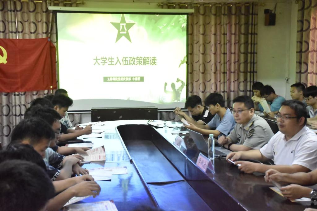 会议伊始,牛建明从历史发展,经济状况,国防建设三个方面分析当前国际形势的严峻,指出参军入伍的重要性,激励学生积极报名入伍。接着,他对大学生应征报名的基本条件、大学生入伍政策及丰富多彩的军营生活做了详细的介绍。