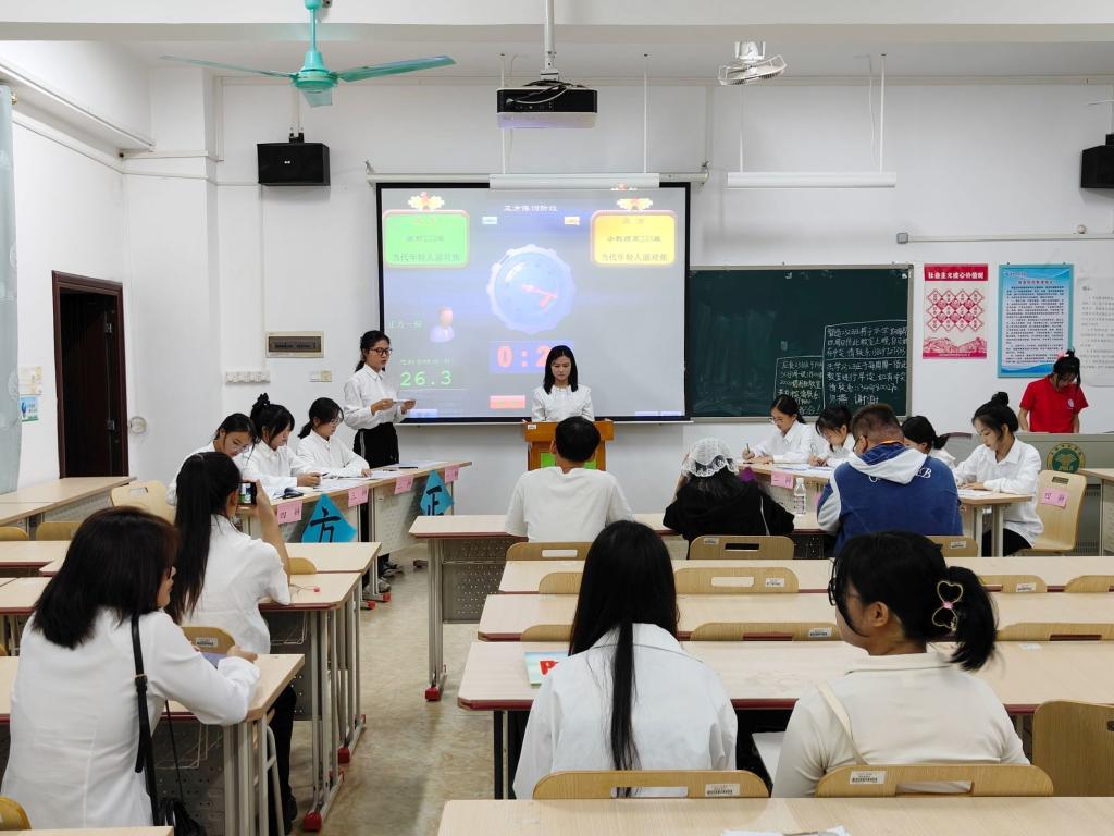 本次辩论赛由我院小学教育(语文和英语方向)2022班徐可、小学教育(语文和英语方向)2023班卢佳鑫、小学教育(数学和英语方向)2023班黄蓝鲜、小学教育文科(定向)2023(1)班黄榆丽担任主持人,教育科学学院、外国语学院、历史与旅游学院、物电学院、政法学院学生代表担任评委。